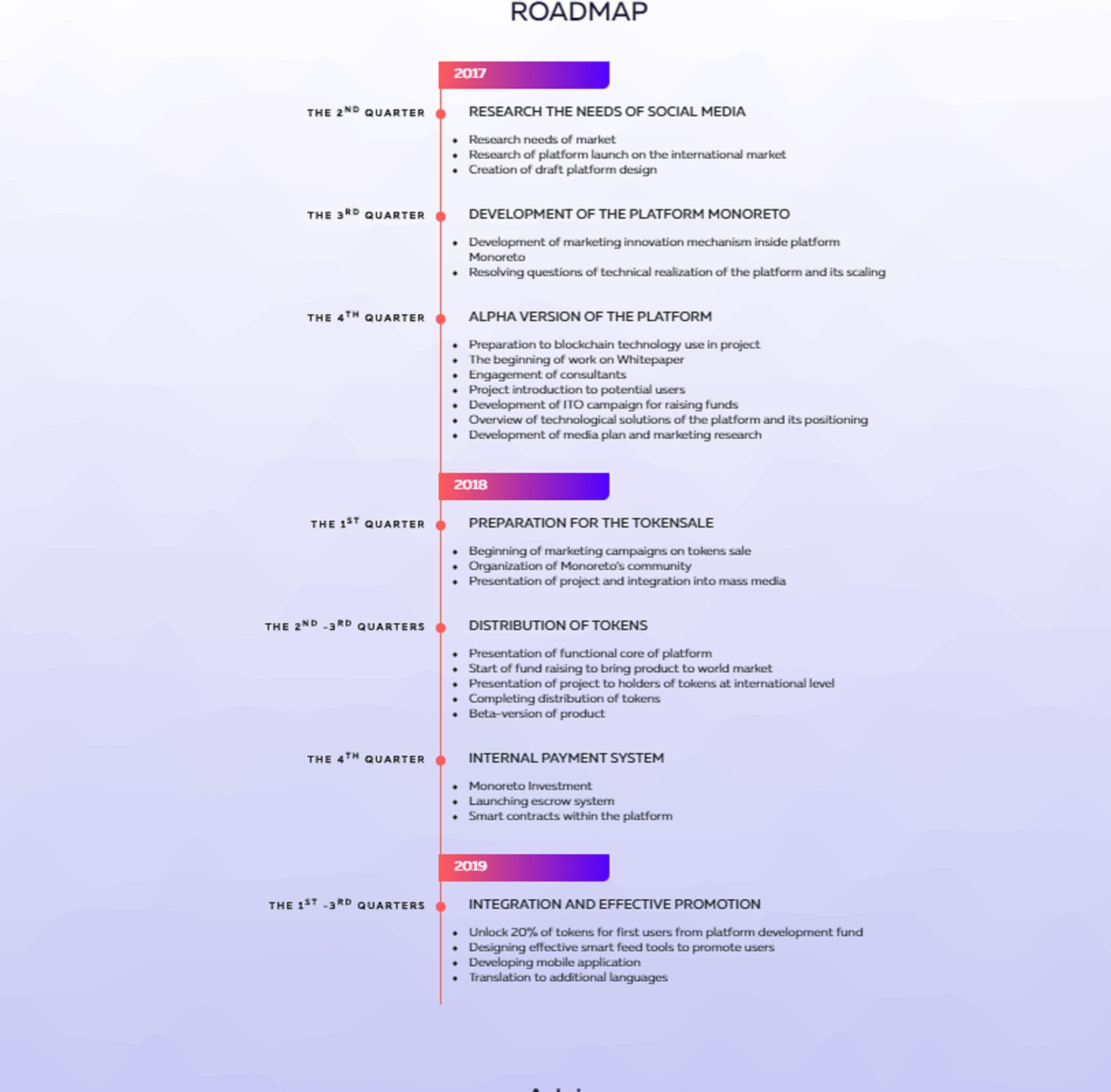 Background for Creating Monoreto Data for January 2018 shows that 2.5 billion people on Earth use social networks every day and post a variety of content ranging from text and photographs to comments and likes. Social network users can be sorted into three categories: • Professional bloggers, opinion makers, photographers (when creation of content is a source of professional income) • Regular users who post quality content but don’t have the opportunity to monetize it • Regular users who do not create quality content (or any content at all) but make use of someone else’s product (photographs, posts, comments) Only a small percentage of users, those included in the first category, are able to monetize their publications by cooperating with brands and companies that promote their services. A significant number of social network users that create high quality and popular content don’t have the opportunity to make money from it (the second category). What happens is that the content earns money for the companies that own the social networks as opposed to the creators themselves. This is how Facebook’s market value has reached $350 billion to date and continues to grow first and foremost because of user content. The overwhelming number of social media users is the audience (the third category). They usually do not create their own content but actively use social networks, ranking and commenting on content posted by others and also communicating with each other. This is the audience that creates the added value of a social network as a product.