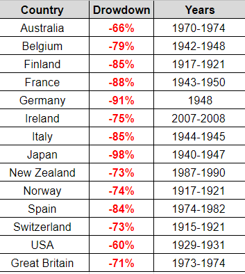 Cryptocurrencies, like any markets, have their own crisis situations. That is what we see on the last chart. The 2018th year was hard for cryptocurrency. Most of them lost in value, while market capitalization fell by 79%. It should be understood that the classical markets at different historical stages also had crises. Let’s look at the maximum fall in stock markets of different countries: