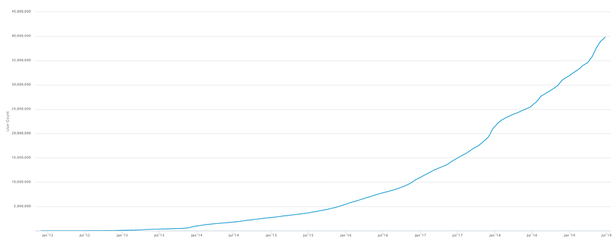 Cryptocurrencies are quite a young phenomenon. Nevertheless, it is already possible to trace some indicators of the industry.The number of Bitcoin wallets https://www.blockchain.com/charts/my-wallet-n-users?timespan=all: