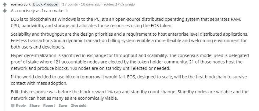 Hello world! With the recent news around EOS launching its mainnet soon I have been getting asked a lot "What actually does EOS do?". I found a great post by an EOS block producer on Reddit.