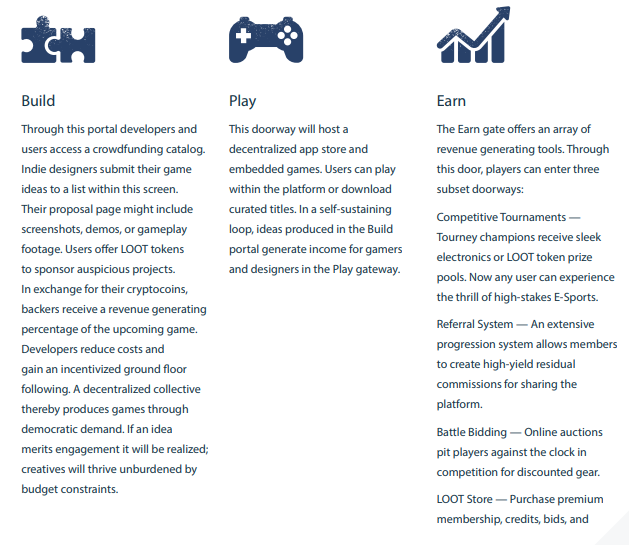 November 1st, 2018 - The Game Forge opens and will feature a list of game projects submitted by developers. Users can select from any of these projects and submit their LOOT tokens to provide developers with a design and marketing budget. When monetized, those games will generate recurring revenue for the developers and any user who submitted tokens.