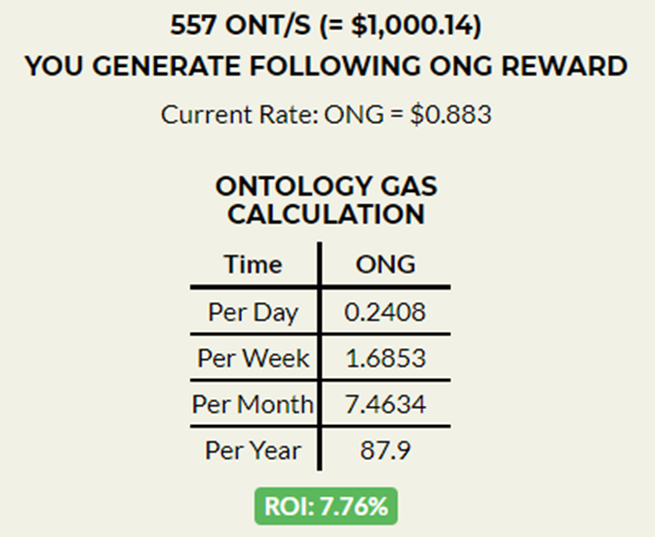 If you invest 557 ONT (1000 USD approximately) , you will passively get 87.9 ONG per year. 7.76 % ROI looks pretty good to me. Also remeber that ONT has an huge potential in the long run.