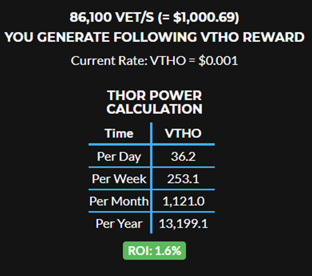 If you invest 86,100 VET (1000 USD approximately) , you will passively get 13,199 VTHO per year. 1.6 % ROI seems low but, VeChain has a lot of potential in the long run.