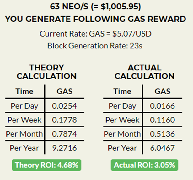 If you invest 63 NEO (1000 USD approximately) , you will passively get 6.0467 GAS per year. 3.05 % ROI may not seem impressive but NEO/GAS has an huge potential in the long run.