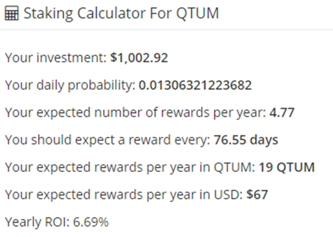 If you invest 285 QTUM (1000 USD approximately) , you will passively get 19 QTUM per year. 6.69 % ROI seems good to me.