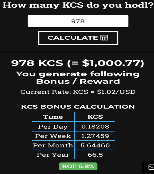 If you invest 978 KCS, you will passively get 66.5 KCS per year. 6.8 % ROI seems good to me.