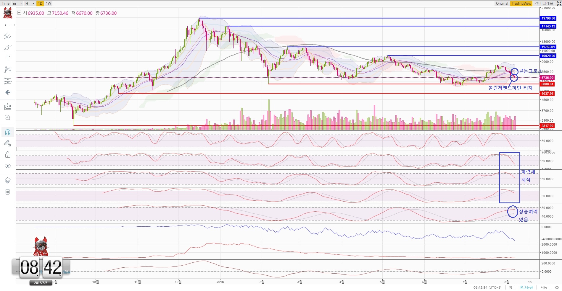 그리고 볼린저밴드 하단을 터치했고 이후 하단선을 미끄러지듯 추가하락을 할지는 지켜봐야 할 상황입니다.
