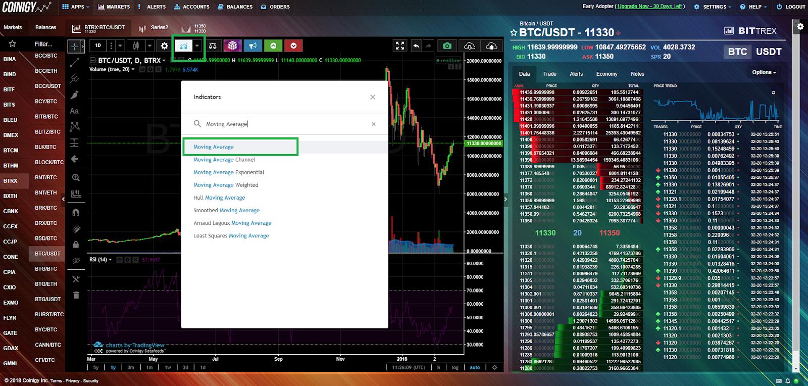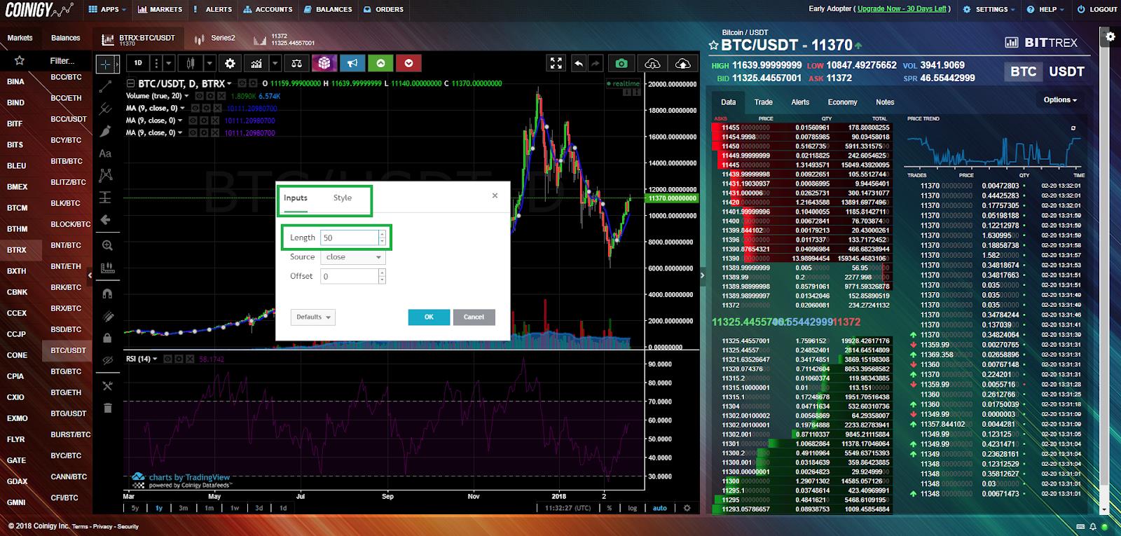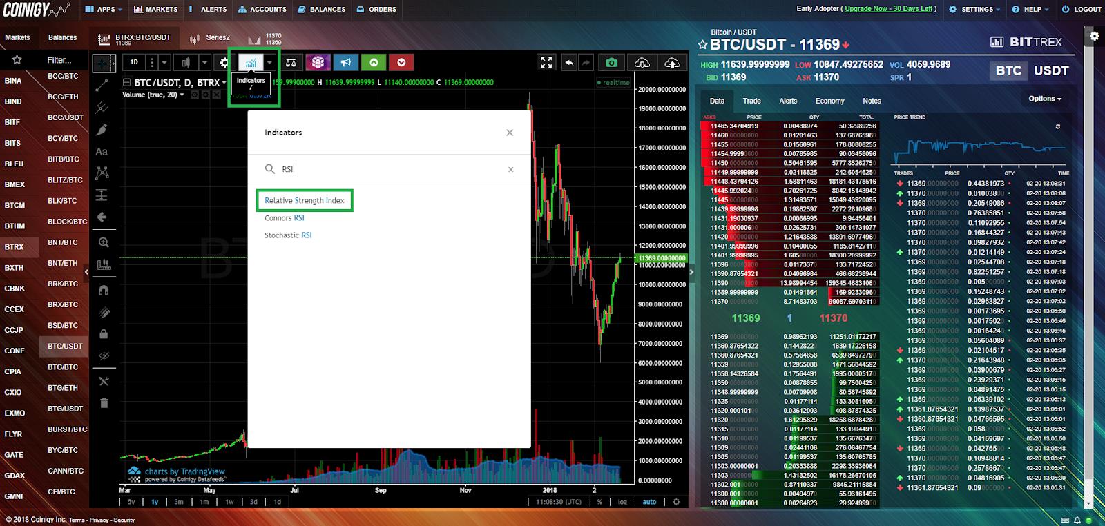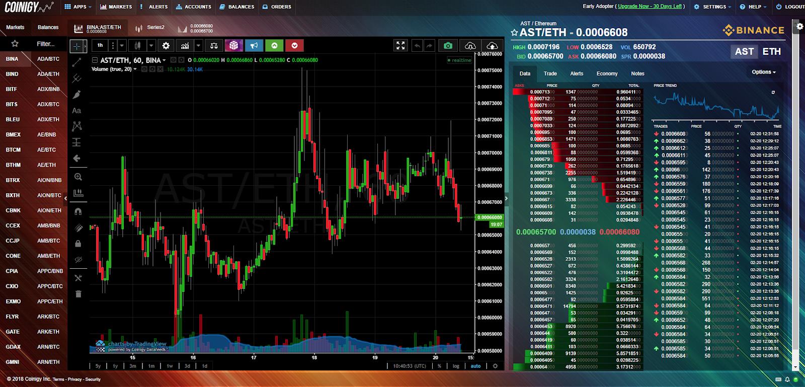 To get started, you need to go to www.coinigy.com and register. This is the platform-aggregator of most exchanges, which allows you to easily and quickly switch between exchanges and coins, and also offers the most demanded analysis tools. The alternative is Tradingview platform - it's not so convenient to switch between violas, but there is a function of subscribing to the analysts you are interested in.