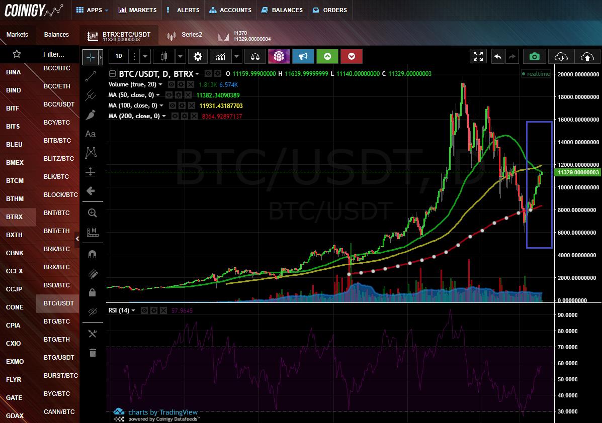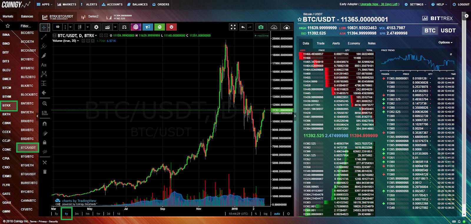 Signs work for any coin. I'll explain with bitcoin, so you need to select a pair of bitcoins / USDT. To do this, in the left column, we first press "BTRX", and then on the right, we find the pair "BTC / USDT". At the very bottom, we show the annual graph. This is what we got (green rectangles allocate places where you need to click):