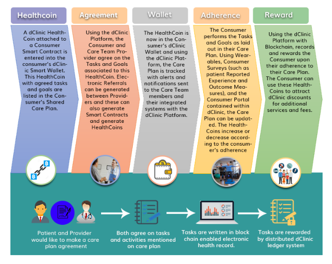 dClinic puts the patient at the centre of their care and does not allow brick walls to constrain their access to care. dClinic uses blockchain to assist and reward consumers for their participation and adherence to their care plans. Thus, dClinic is poised to disrupt the healthcare industry by introducing a new model of healthcare which encourages collaborative efforts for positive healthcare outcomes.