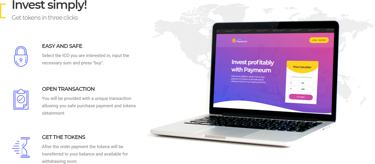 Paymeum - is a unique platform for investors engagement and a flexible tool for profitable investments in crypto-currency. Using our platform you don't have to spend time searching and examining projects, as we find and check perspective ICOs by ourselves and coperate with known ICOs. This means that you can byu tokens 15-50% cheaper than official price on our platform.