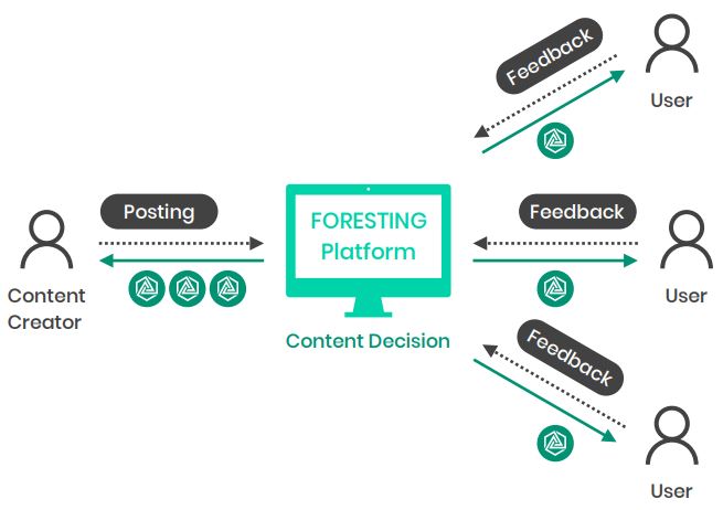 В центре всех трех отделов экосистемы стоит пользователь. Отправной точкой для механизма сети Foresting является поставщик контента. Участники взаимодействуют с каждой составляющей платформы следующим образом: автор написал статью в социальной сети Foresting, получил хорошие отзывы от других участников, рейтинговая система Foresting Lab высчитала вознаграждение за его работу, на кошелек в цифровом Foresting Bank'е он получил PTON токены.