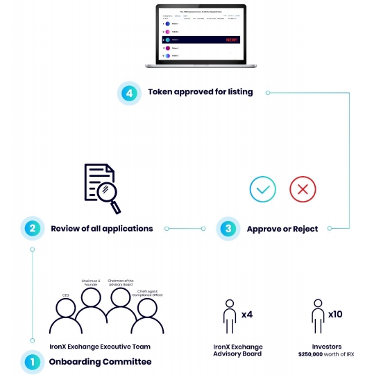 Листинг является важным процессом для любой биржи, IronX не исключение. Для упрощения процесса листинга было решено создать специальный "комитет по адаптации". Комитет будет заниматься рассмотрением заявок на включение в список, а так же голосованием для утверждения или отклонения. Таким образом, IronX сохранит свою репутацию, не допуская скам-монеты на биржу. В состав комитета войдут: основатель (он же председатель), генеральный директор, главный сотрудник по правовым вопросам, председатель консультативного совета, четыре отраслевых консультанта из консультативного совета IronX и десять инвесторов, имеющих IRX токены эквивалентные не менее 250000 тыс. долларов на своих корпоративных или индивидуальных счетах. Комитет будет очень тщательно подходить к рассмотрению заявок, что позволит принимать на биржу токены компаний с высокой репутацией и законными бизнес-моделями.