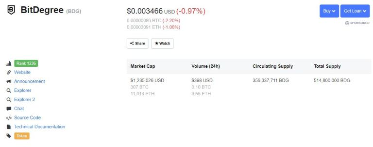 Bitdegree bermula pada august 2017 dan mula melancarkan ICO pada akhir december 2017. Bitdegree merupakan sebuah ethereum token erc20. Sedikit detail berkenaan dengan bitdegree daripada coinmarketcap. rank 1236 pada 7 december 2018.
