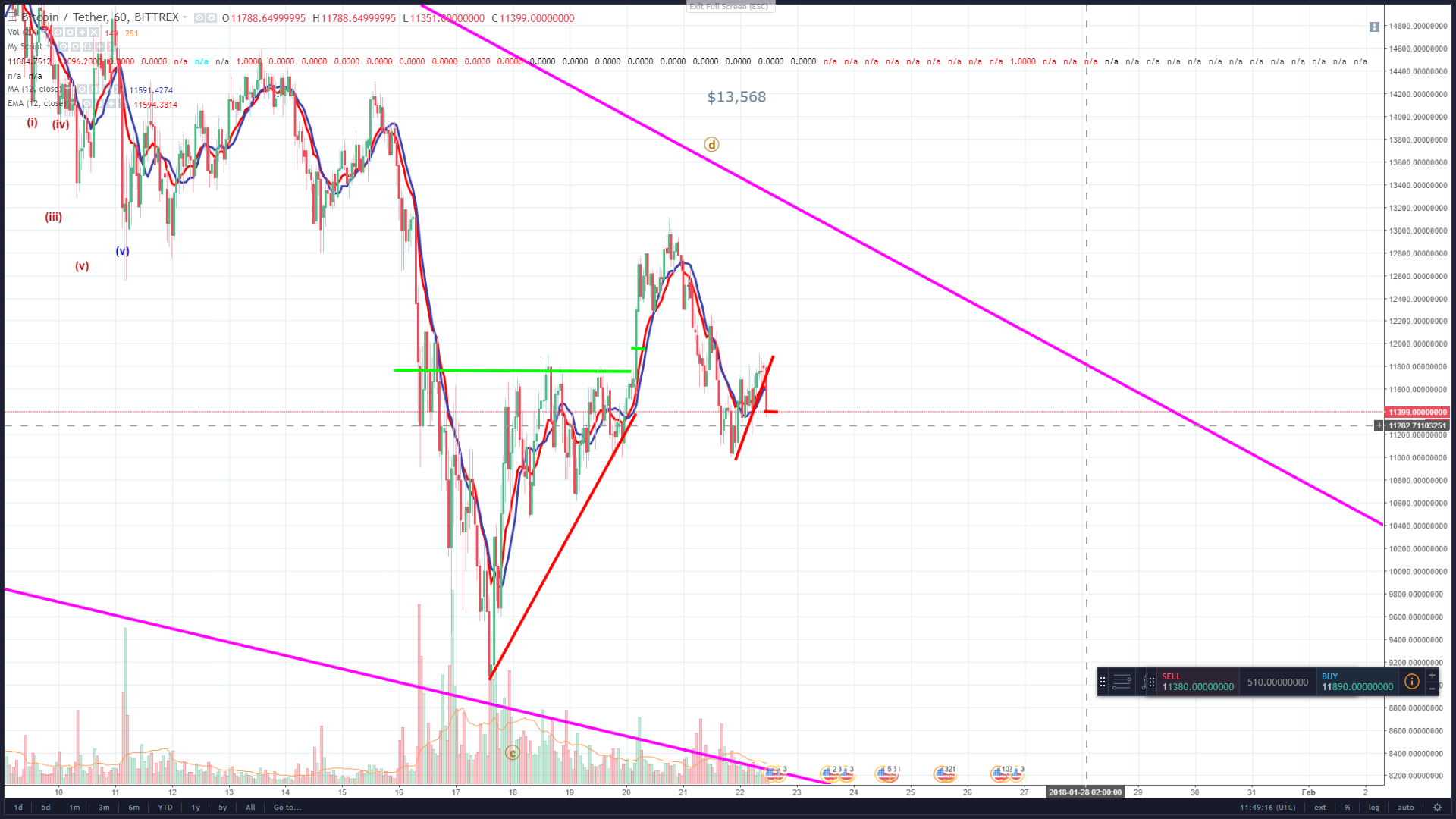 My alternate account would be that we have completed a ABC correction and are now finalising wave 2 of the impulse wave. If that were the case then wave 3 would break through the wedge and signal the resuming of the BTC bull run, however I do not think this will be the case.