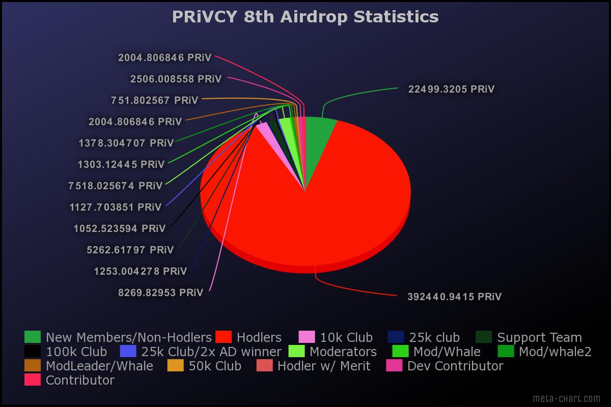 450,000 PRiV have been successfully distributed to all accepted participants and part of the team, which includes whales and multiplier winners for trading competition for this week 8. I have prepared a pie chart states how much and what percentage of PRiV have been dropped to those participants, per each and total in different categories: