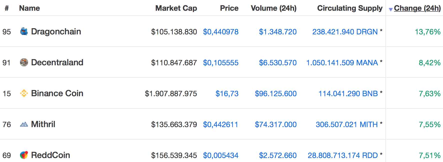Best performing Cryptocurrency in our top 100 chart, measured by their market capitalization, and the only double digit increase is Dragonchain [DRGN] with an increase of nearly 14% over the course of the last 24 hours followed by Decentraland [MANA] showing an decrease of more than 8% today: