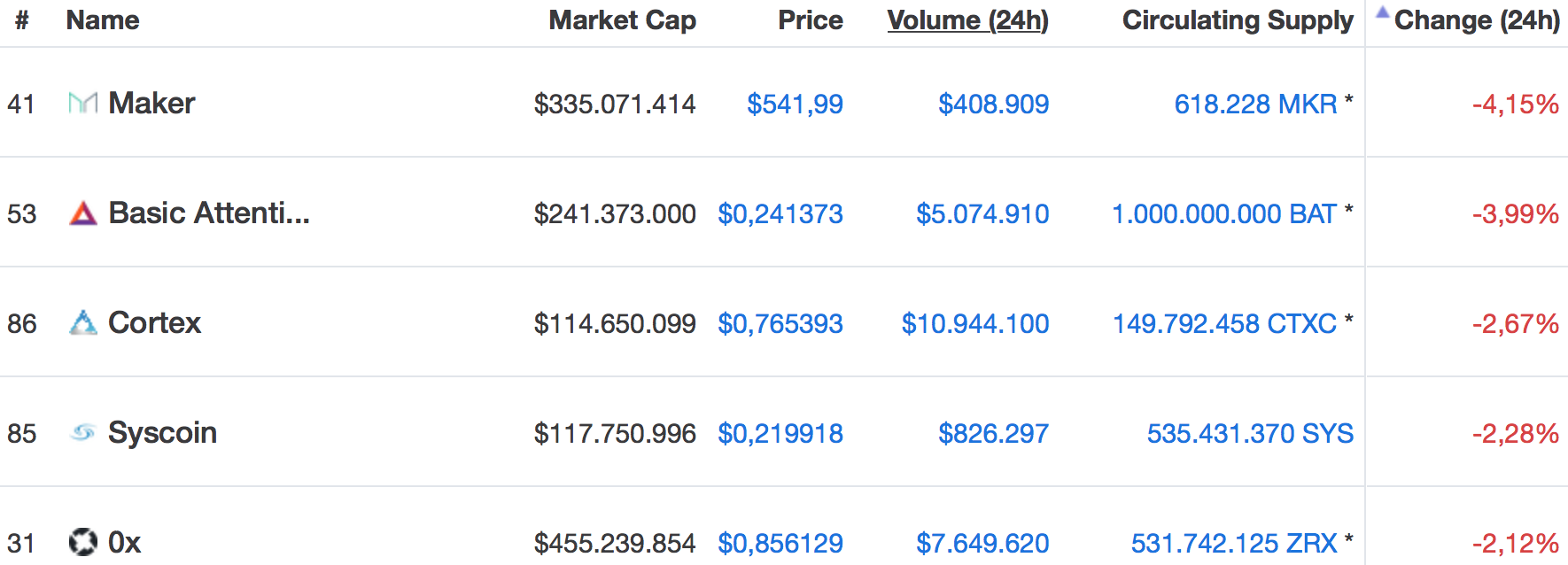 Worst performing Cryptocurrency in our top 100 chart is Maker [MKR] today with an decrease of more than 4% over the course of the last 24 hours shortly followed by Basic Attention Token [BAT] showing an decrease of nearly 4% today: