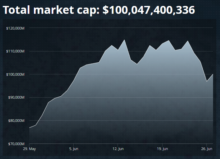 Over the last two days the entire cyptocurrency market was on a downward spiral. But a recovery of is on its way. The previously all time high market cap of $155 Billion dropped below $90 Billion. This caused many to believe the bubble has been burst and that it was only downhill from here. However, the total market cap climbed back up to 100 billion later that day.