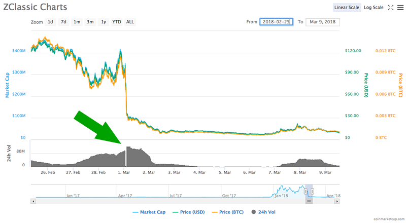 Notice the trade volume levels across the bottom of the chart. You can clearly see when the snapshot took place and trading basically stopped. Shortly after, trading resumed with increased volume as speculators tried to sell their ZClassic, sending the price plummeting. Chart from coinmarketcap.com.