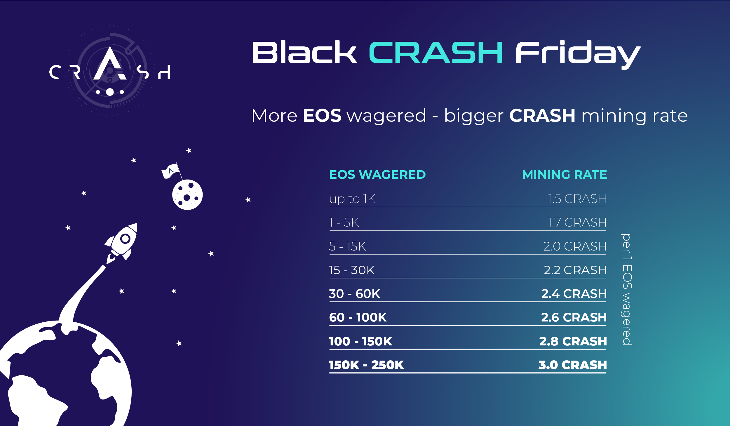 At the moment for every 1 EOS bet you mine 1.5 CRASH tokens. but now you are able to get twice bigger with new holiday feature! More EOS wagered- bigger CRASH mining rate!