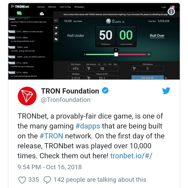 TRONbet, as the “dapp” is called, is an online dice game launched on the top of Tron blockchain network. The competition attracted a lot of users on Friday & during the weekend, eventually clocking over 500k transactions. The Tron network witnessed a surge in its volume on Monday as well. &, at one point, it surpassed Ethereum transactions, which was ranging between 500k-600k on the same day.