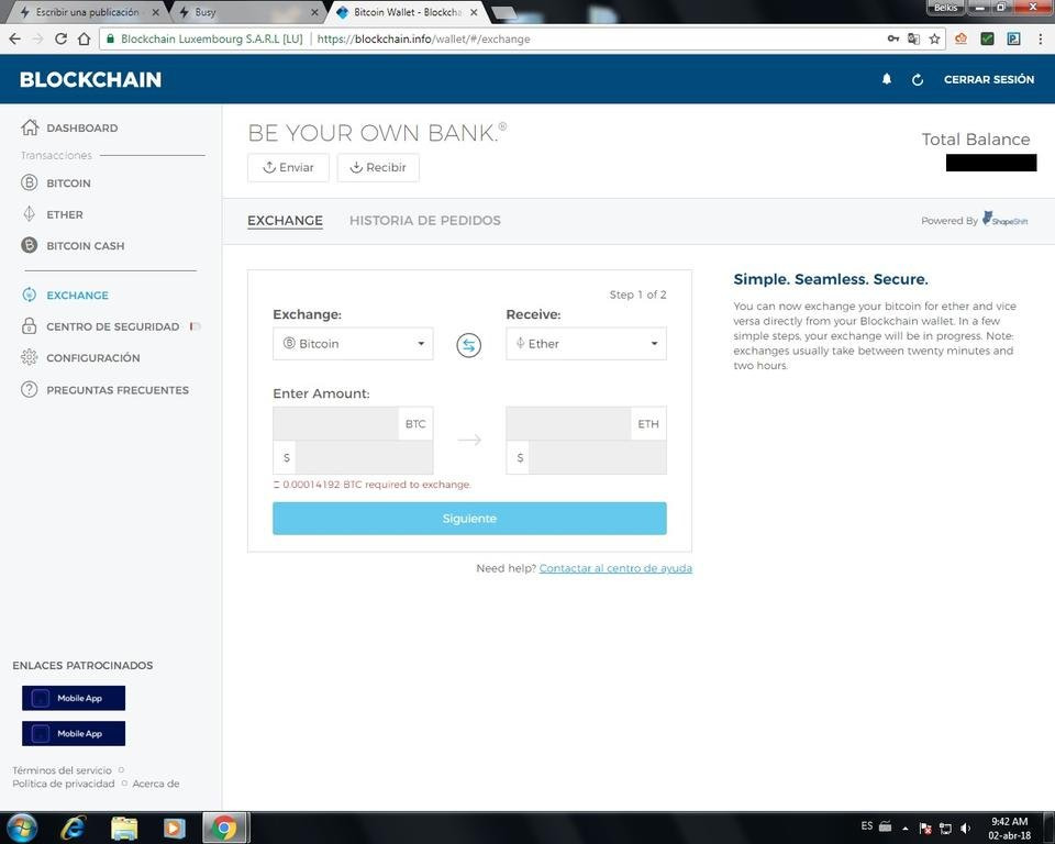 This wallet is not the best, not the most special but it has support for three criptomonedas (bitcoin, Ether and Bitcoin Cash) and we have the availability to make an exchange between them three on the same platform, as you can see in the image below.
