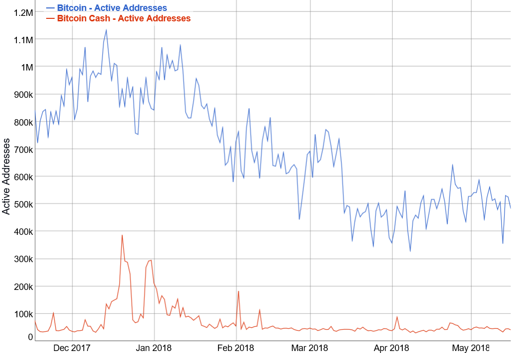The hard fork has increased Bitcoin Cash’s block size from 8 megabytes to 32 megabytes. However, the largest average block on the Bitcoin Cash’s blockchain in May was only 99 kilobytes, or 0.3% of 32 megabytes, according to bitinfocharts.com data. In comparison, it was 631 kilobytes in case of the Bitcoin’s blockchain.
