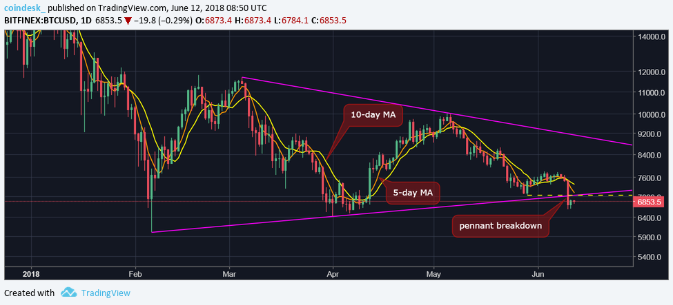 As mentioned yesterday, the draw back break of the pennant pattern has revived the market and opened the doors for a drop below the Gregorian calendar month low of $6,000. The pennant breakdown additionally adds credence to BTC's pessimistic shut below the 50-week MA in might.