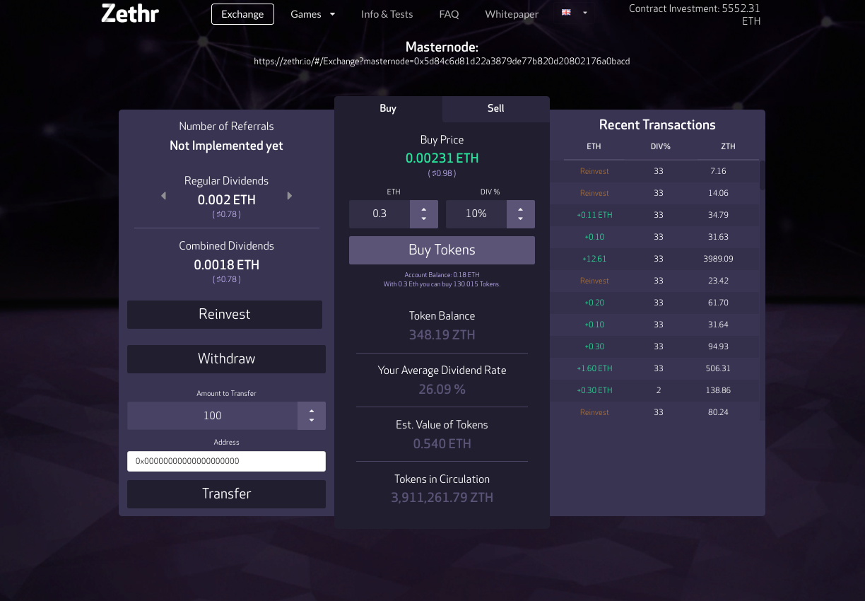Below you will see the current amount of Zethr tokens purchased as well as the current dividend %. We plan on keeping this as our base investment and will withdraw any dividend earnings at the end of each day.