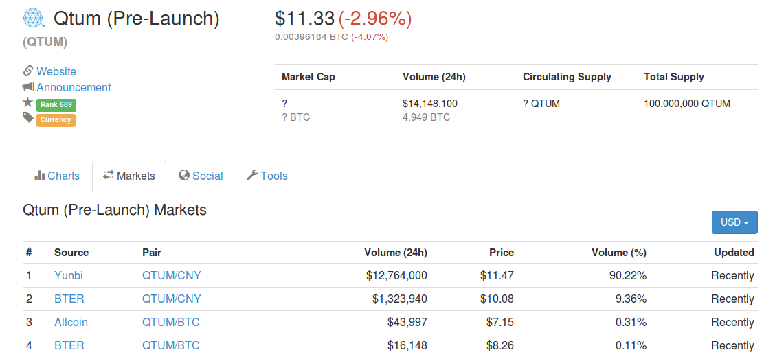 The coin isn't launched but his value is already about 11$. You can only trade it on China Markets. 90% of the market is on yunbi.com. People underestimate how it is difficult for the World Wide to move on the website for buying QTUM. In addition you need a passport to verify your account.