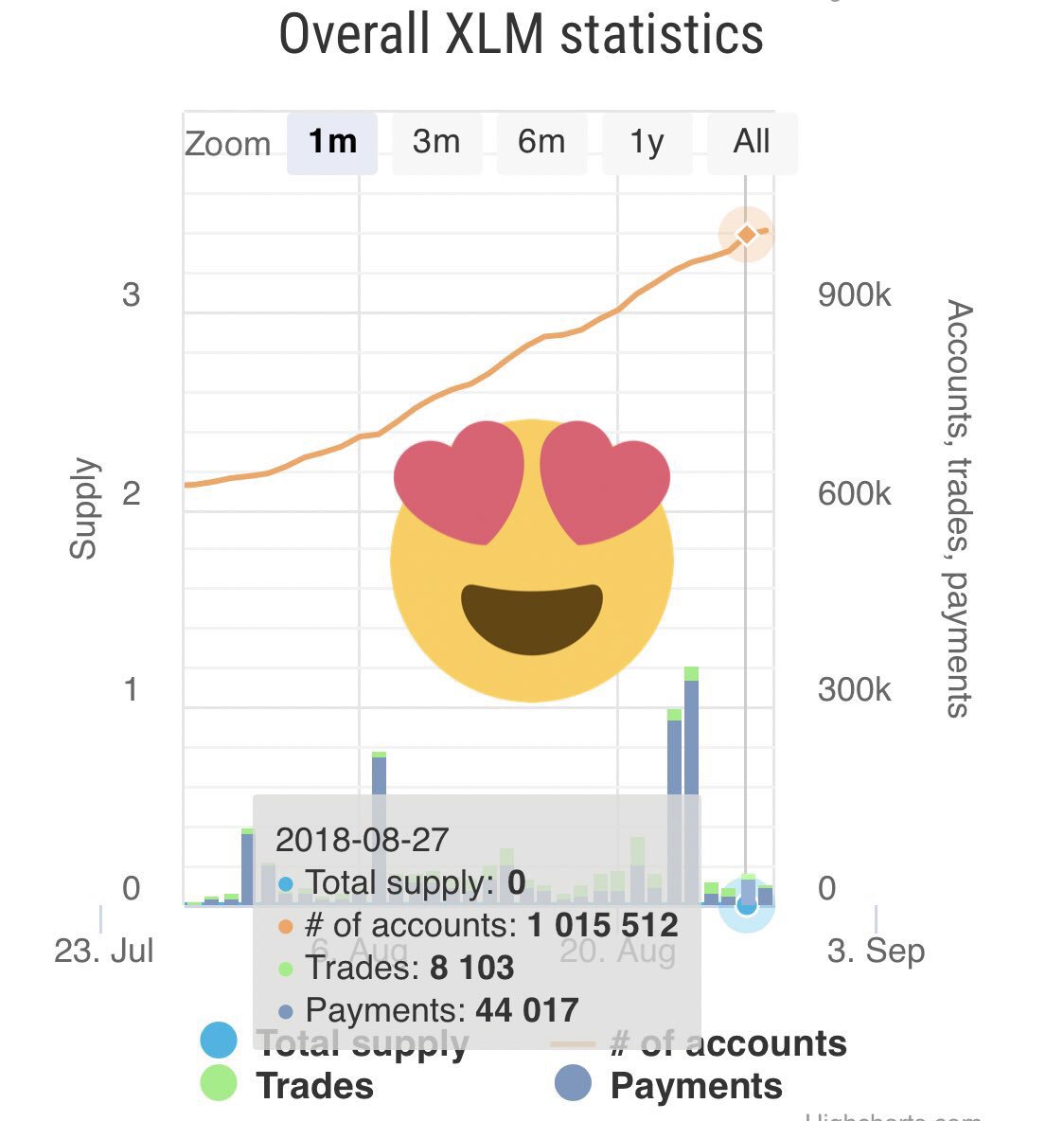 Stellar has achieved the 1 MILLION active accounts MILESTONE!!gssk29 (25)in #cryptocurrency • 8 years ago It’s OFFICIAL. Stellar has achieved the 1 MILLION active accounts MILESTONE. EPIC mark for $XLM: 3,300+ Stellar assets 25 million payments 8 million trades The WORLD‘s READY for the fastest-growing usable BLOCKCHAIN TODAY! #stellar #lumens #blockchain #crpyto