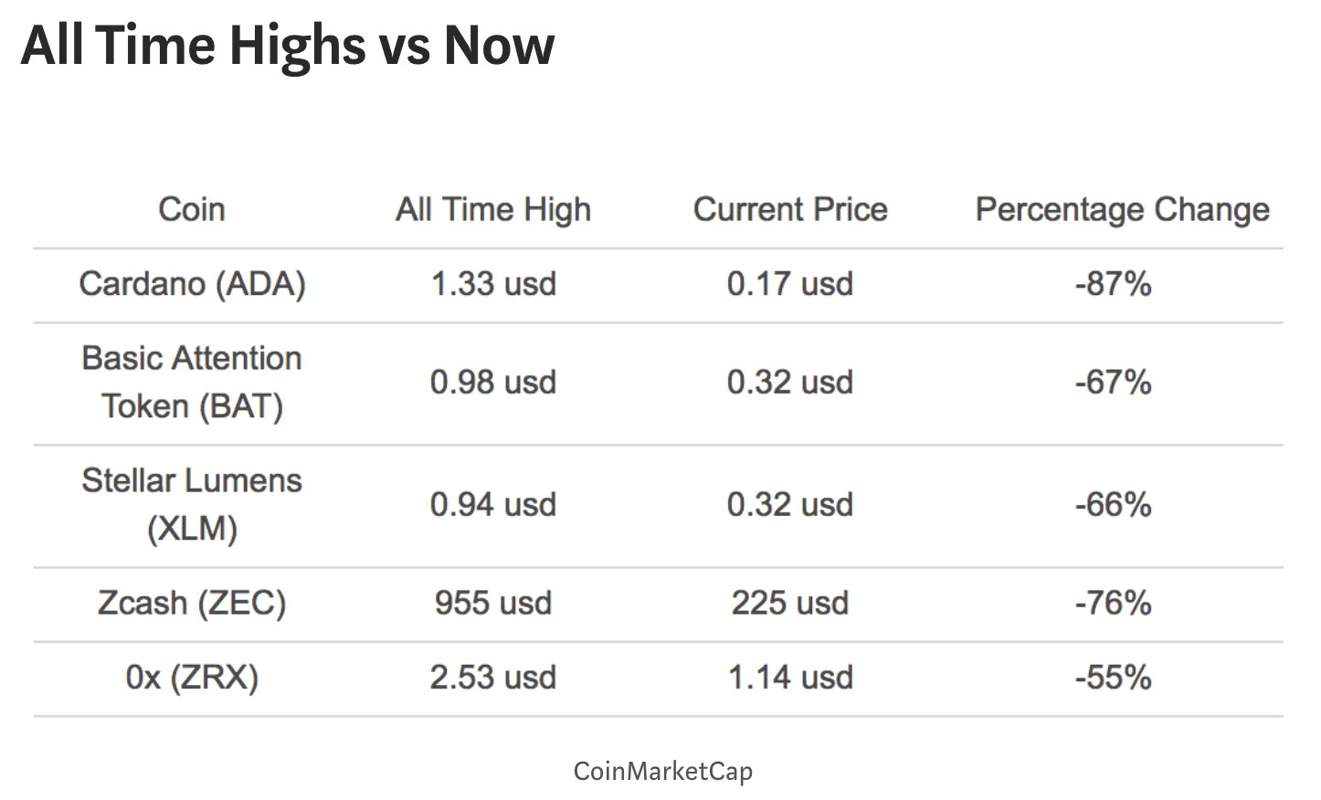 Cardano has since the biggest decrease (-87%) followed by Zcash (-76%), Basic Attention Token (-67%), Stellar Lumens (-66%), and 0x (-55%).