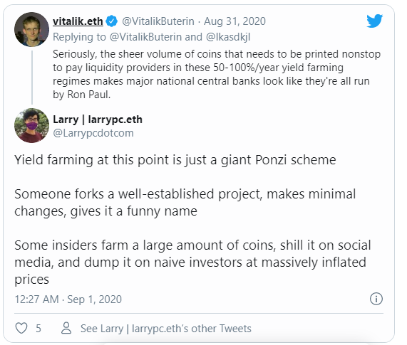 Ethereum’s co-founder has taken aim at coins designed to incentivise yield farming, comparing their underlying economics to irresponsible monetary policies