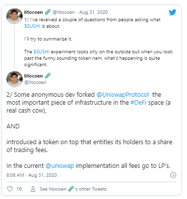 As to what this new item is, a commenter described it as "essentially Uniswap but with a native governance token given to LPs that generates revenue from trading fees."