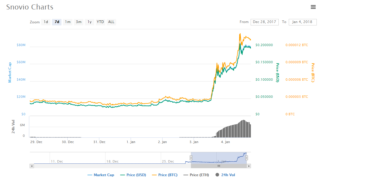 SNOVIO's ICO sale ended about a month ago at a price of ~ 1 cent. Today, this token hit $0.20 and is having a slight price correction at the moment.