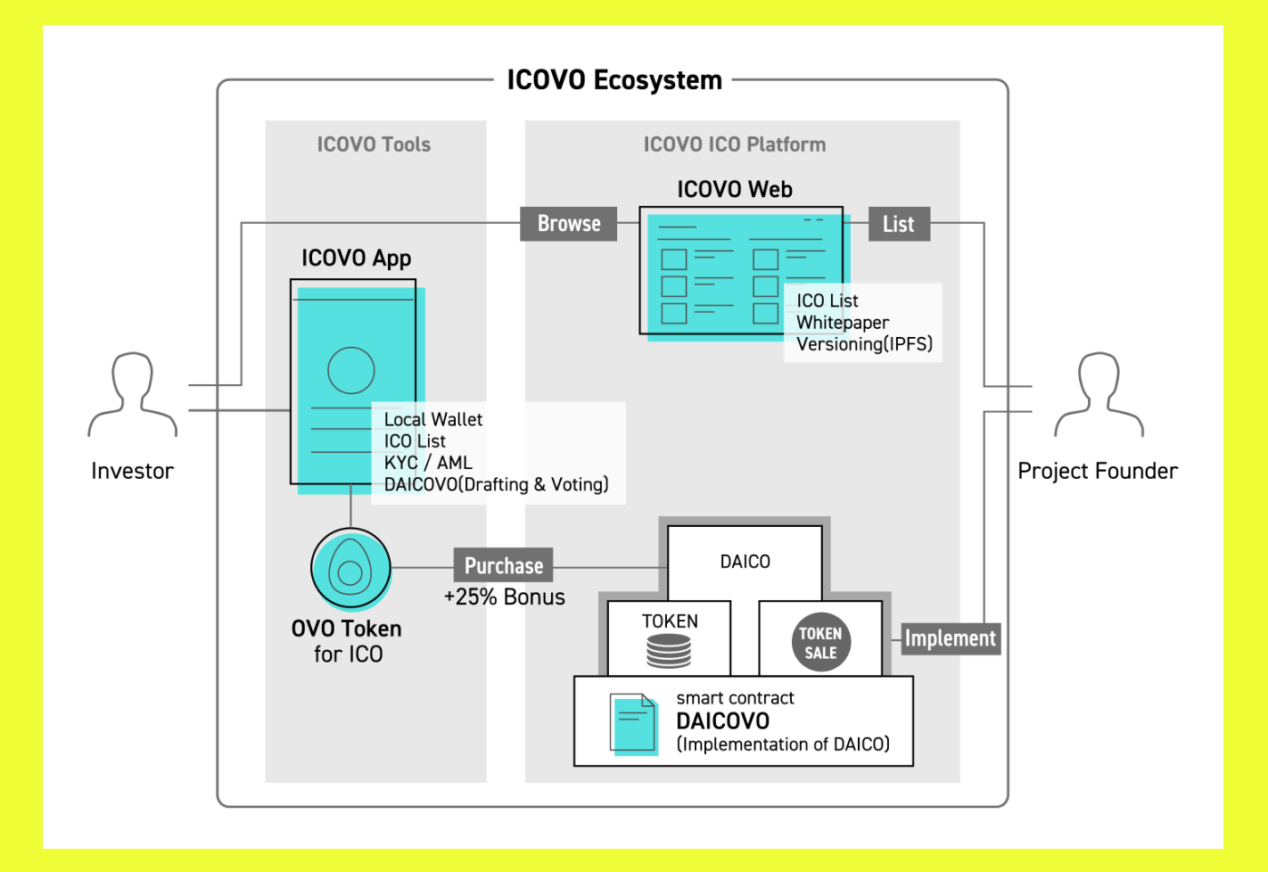 Only ICO projects that are pre-approved and that implement DAICO will be allowed on this platform. For these projects, ICOVO tokens called "OVOV" will be released at a 25% discount on the cost of ETH tokens. To solve the problems with high barriers to participation in ICO, the platform will release an optimized "ICOVO application" and "ICOV Web". This will replace MyEtherWallet which can be a bit confusing for beginners.