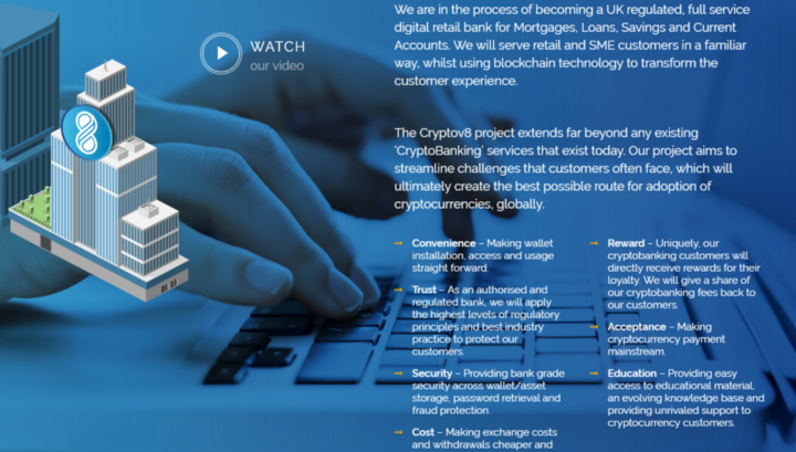 Cryptov8 akan menjadi bank ritel dengan layanan lengkap dan tim akan ramah terhadap semua pelanggan ritel dan UKM. Bank didirikan oleh kontrak bahasa Inggris yang disediakan untuk menyediakan hipotek, pinjaman, tabungan, dan setoran cek. Proyek ini lebih unggul dari proyek-proyek yang ada dan tim yang bertujuan untuk mewujudkan proyek ini akan memperluas adopsi cryptocurrency di seluruh dunia dengan tujuan menyederhanakan masalah yang dihadapi pelanggan sebagai akibat dari kehadiran bank.