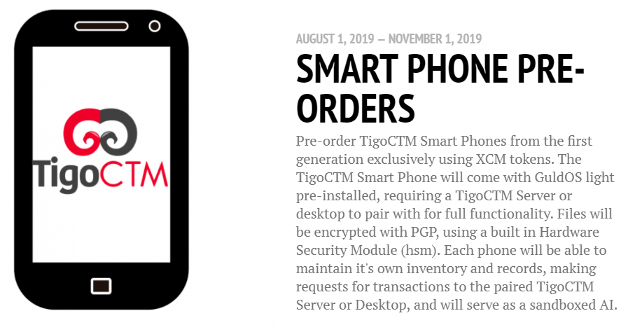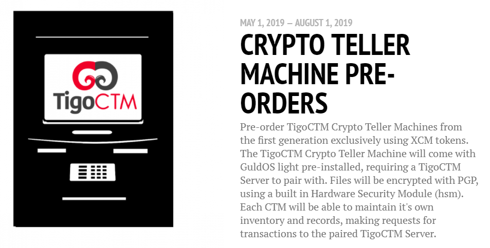 X Coin Machines (XCM) are gift certificate tokens for TigoCTM. Each XCM is redeemable for $10 worth of hardware from TigoCTM at up to 50% off the retail price. ICO proceeds will go to funding the production of the first line of TigoCTM's products.