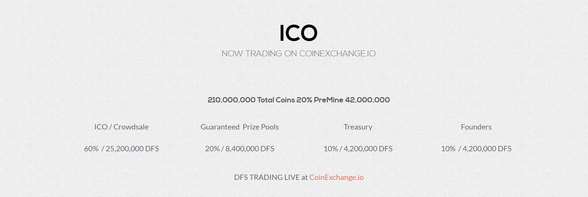DFS Coin have a maximum supply of 210 Million and out of which 42 Million have already pre-mined. For every new registration on Daily Drafts website, each user get 1000 DFS coins for free which he can use to enter into many contests as well as compete against various users all around the World.