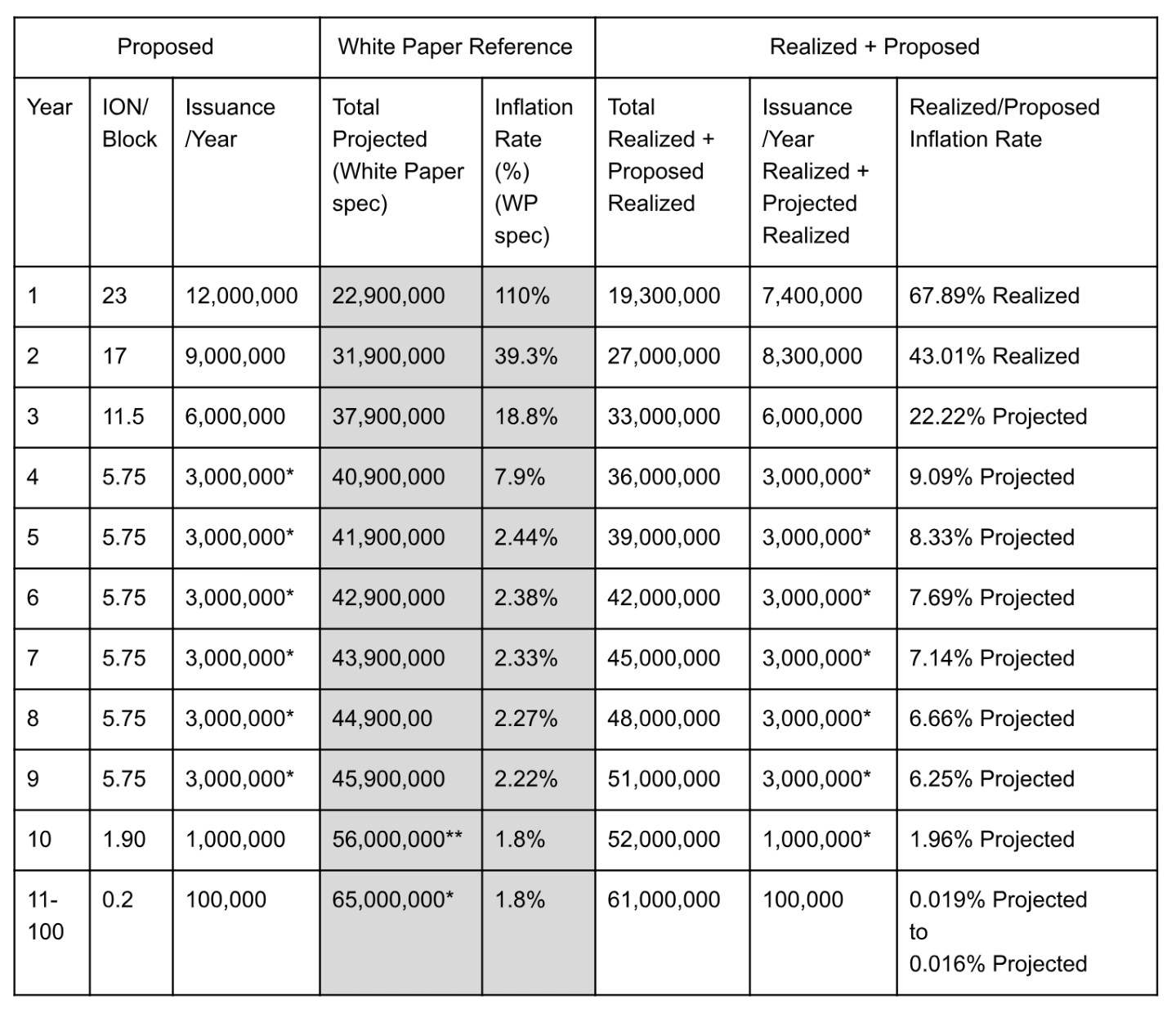 The first proposal introduced by Adam Matlack is a soft fork happening in the next update if approved by the community which would see 6 million ION coins added to the total available supply. According to Matlack the team has determined production of ION is behind. To explain he cites Fig. 1, pointing out the first years issuance in terms of what should have happened (the creation of 12 million ION) and what actually happened (only 7.4 million ION were created).