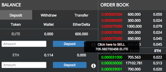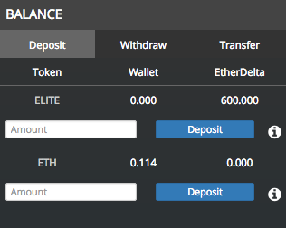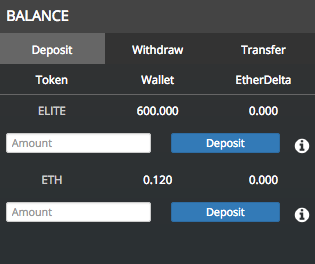Dopo aver atteso pazientemente per l'approvazione della vostra transazione, la quale puó richiedere anche parecchie ore, dovreste essere in grado di visualizzare nella sezione BALANCE alla scheda DEPOSIT sotto la colonna ETHERDELTA il bilancio degli ELITE token che avete trasferito dal vostro ERC20 wallet sulla piattaforma.