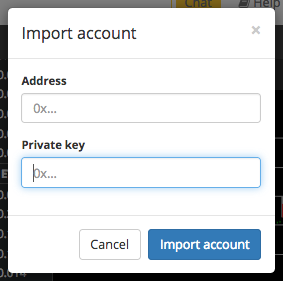 Se avete deciso di utilizzare la prima opzione, vi apparirà una finestra pop-up dove dovrete inserire l'indirizzo del vostro ERC20 wallet e la chiave privata corrispondente. A questo punto cliccate Import account per caricare i dati del vostro wallet nella cache.