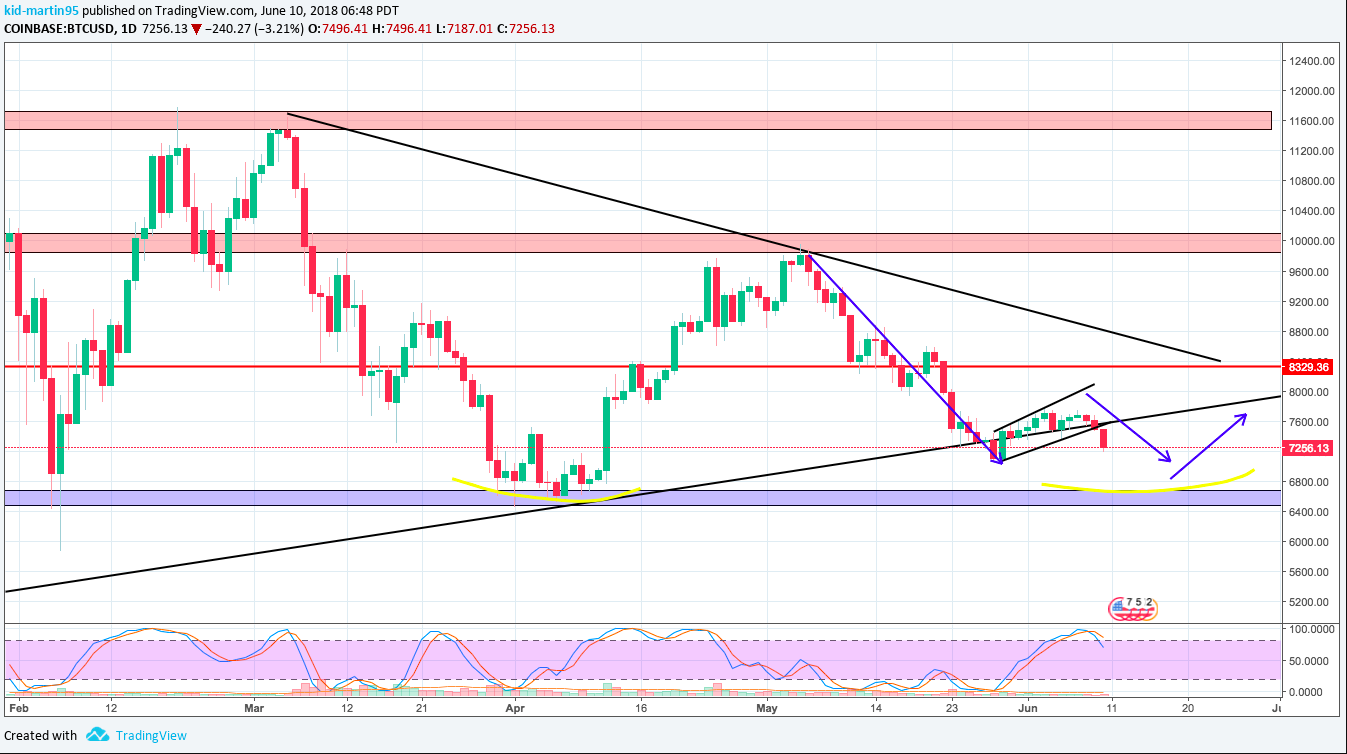 Daily : Showing dynamic support has been pierced, and we could be seeing a drop towards $6,700.
