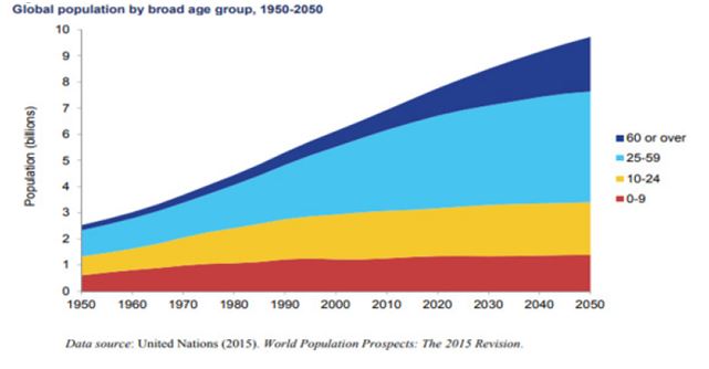 These medical advances and global cooperation have in themselves brought other challenges, as an example improving quality of life in an aging population; please refer above to the graph, indicating an upward trend for life expectancy of all age groups.