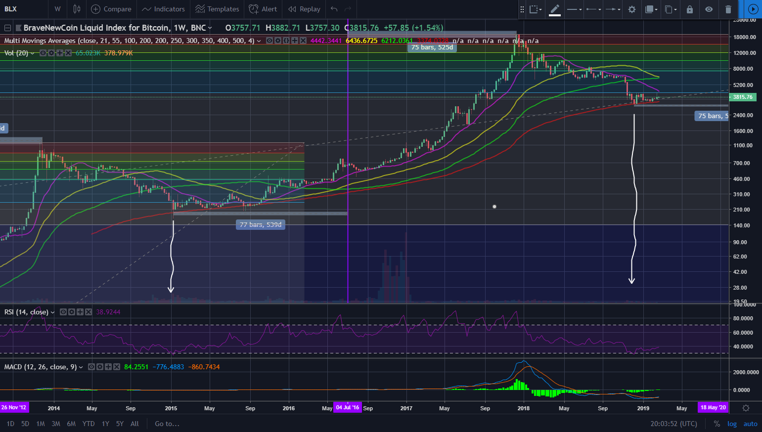 Next look at the level of RSI of the absolute bottoms (potentially) of the bear markets. Also please ignore the amount the white lines curve as they are pointing down towards the RSI, I am not drunk, I am just too lazy to put on the arrows shape on to have it all nice and straight.