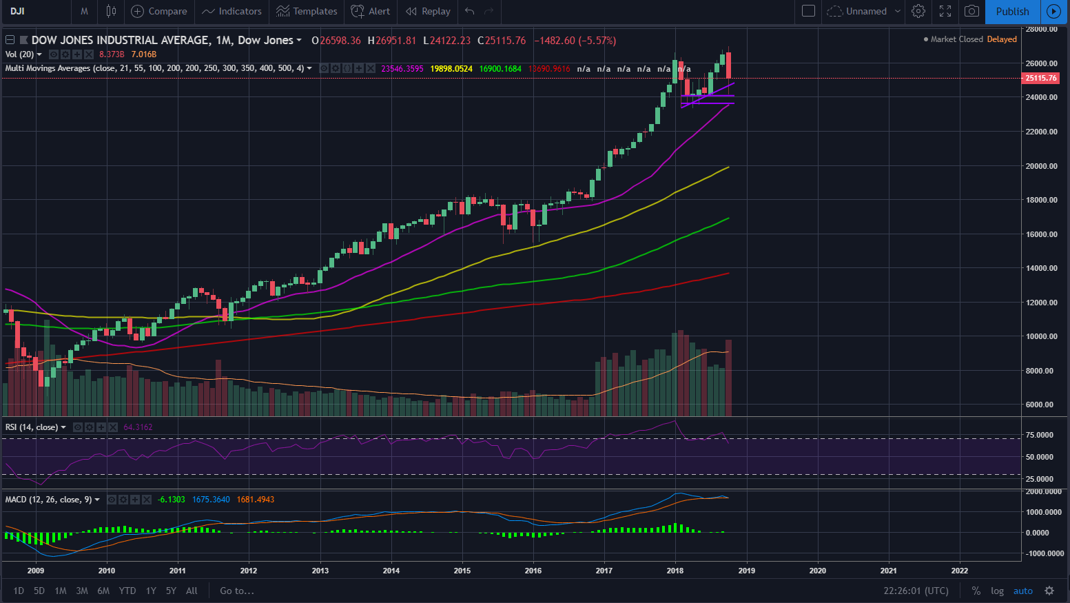The monthly chart for the DJI does not look healthy either. With a bearish engulfing candle followed by a bearish cross over on the MACD, it does not imply that the sell side of the stock market is over, actually looks like its just getting started.