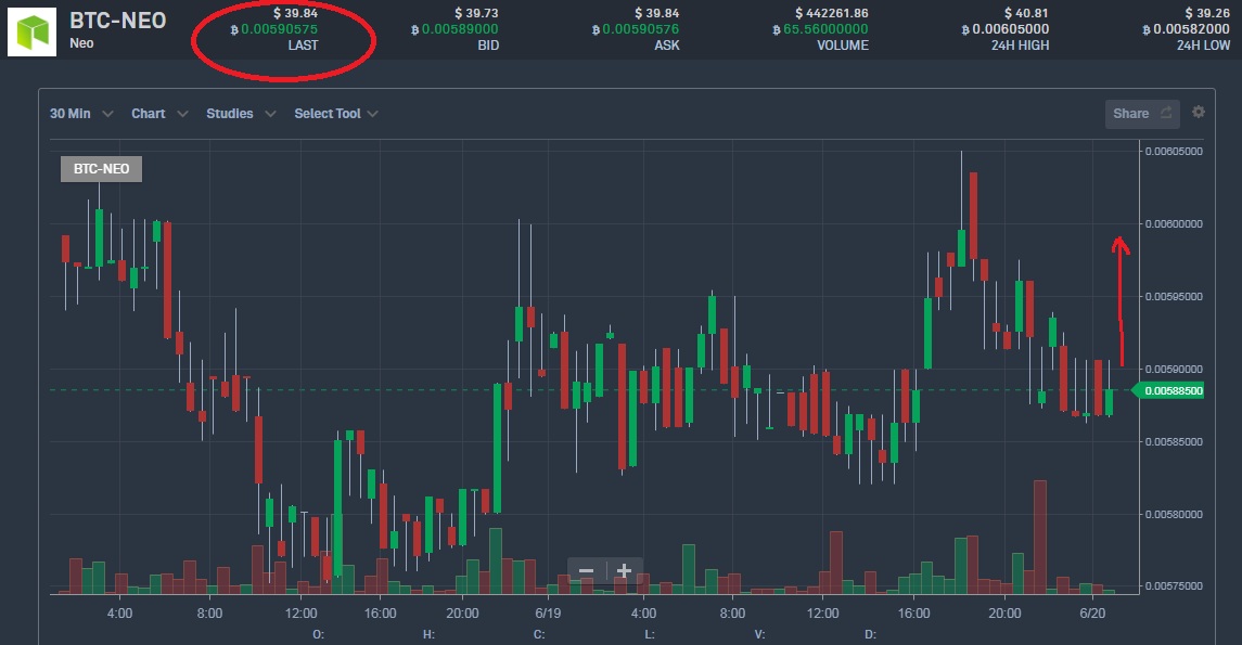 See the chart below, you can see the green candle going upword. That's mean the the price is going up. Neo coins can be a good bonus for you. It is expected that the price will be around $40 USD in this week.
