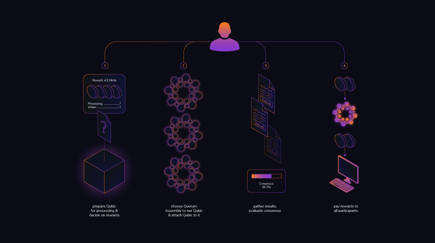 An important feature of Qubic should also be that unused computing power is collected over a decentralized network and the resulting power for external calculations should be made available. In this case, people who do not have strong hardware can place an order that the powerful decentralized platform executes and in the end only the result is output to the person.