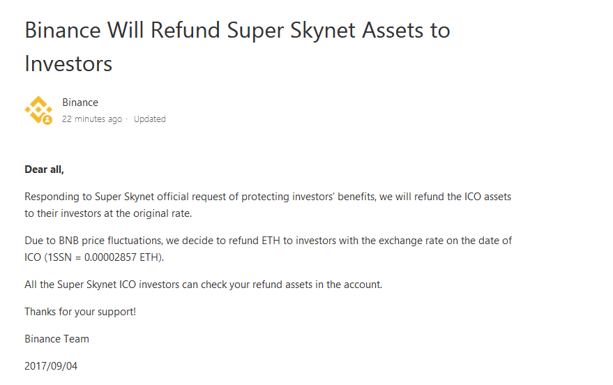 Binance will return all the ICO money to all its investors to start with.